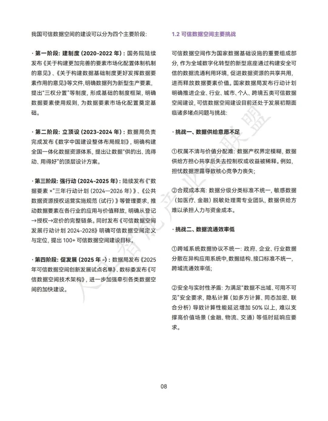 数据 产业面临“不敢共享、不愿共享、不能共享”的困局如同无形枷锁禁锢着 AI 创新的步伐。 比如医疗数据因隐私顾虑难以赋能疾病预测模型,工业数据因竞争壁垒阻碍供应链协 同优化,金融数据因权属模糊制约风险管控精度,这些挑战的本质,是数据要素市场化 配置过程中“信任基础”的不足,也将严重制约着人工智能产业的发展。 国家数据局重磅出台《可信数据空间发展行动计划(2024—2028 年)》,以国家战略方 式推动可信数据空间的加速建设,预计 2028 年国内将建成 100 个以上可信数据空间, 包括城市、行业、企业、个人、跨境五类可信空间,打通数据要素流通的“最后一公里”。