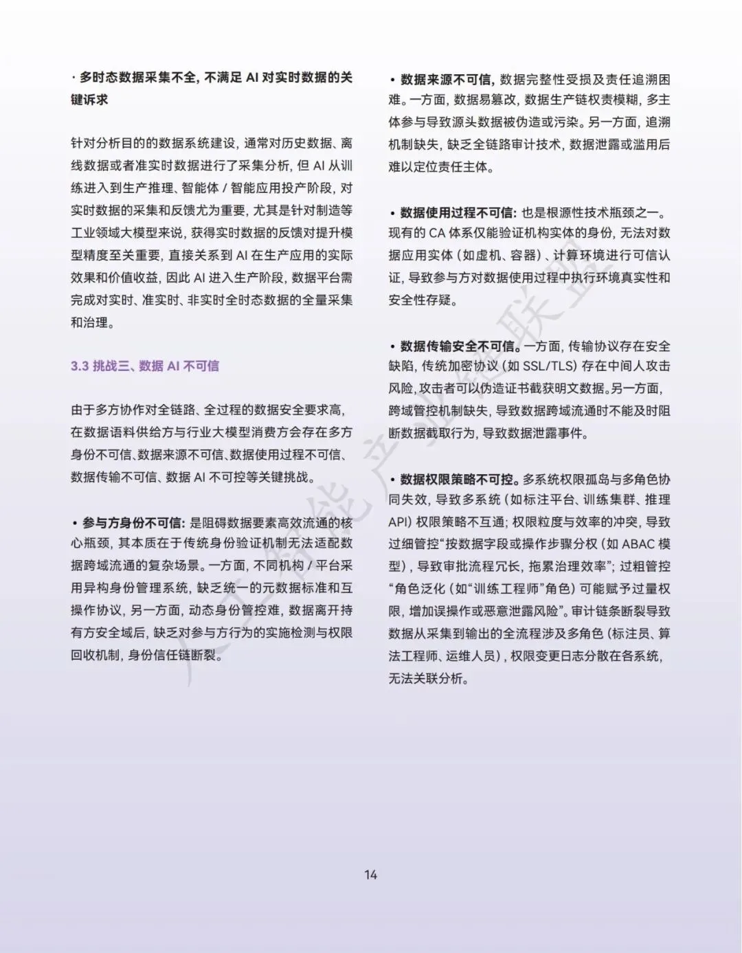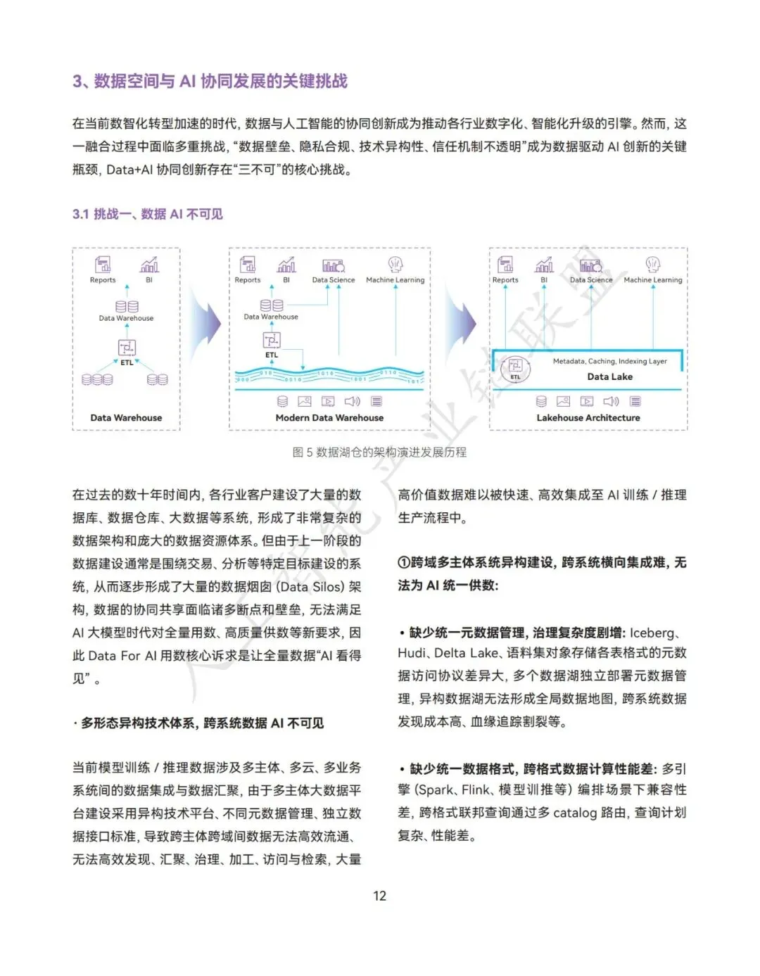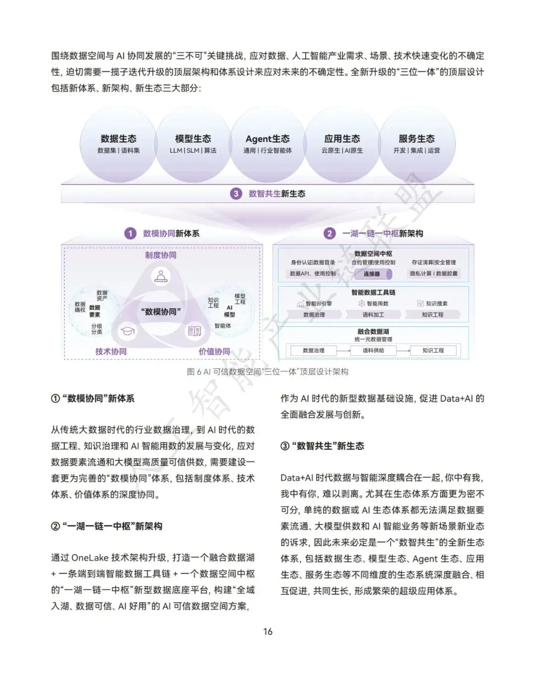 在 AI 时代,可信数据空间是战略级新型数据基础设施,它不是单一技术、工具的堆砌,而是 制度规则、技术架构、生态系统三位一体协同的创新范式,将成为全域数字化转型的核 心数字底座。 随着人工智能技术指数级增长,生产型 AI 场景爆发式应用,大模型对高质量数据的“饥 渴需求”进一步放大了可信数据空间的价值。本白皮书结合新技术的理解与创新实践的 探索,梳理可信数据空间与 AI 协同发展的技术路径、制度框架与实践蓝图,提出 AI 可 信数据空间的顶层设计与创新架构,希望借此推动产业共识,联合各界探索数据要素市 场化改革的灯塔,共同开启“数据可信即 AI 未来”的新纪元。