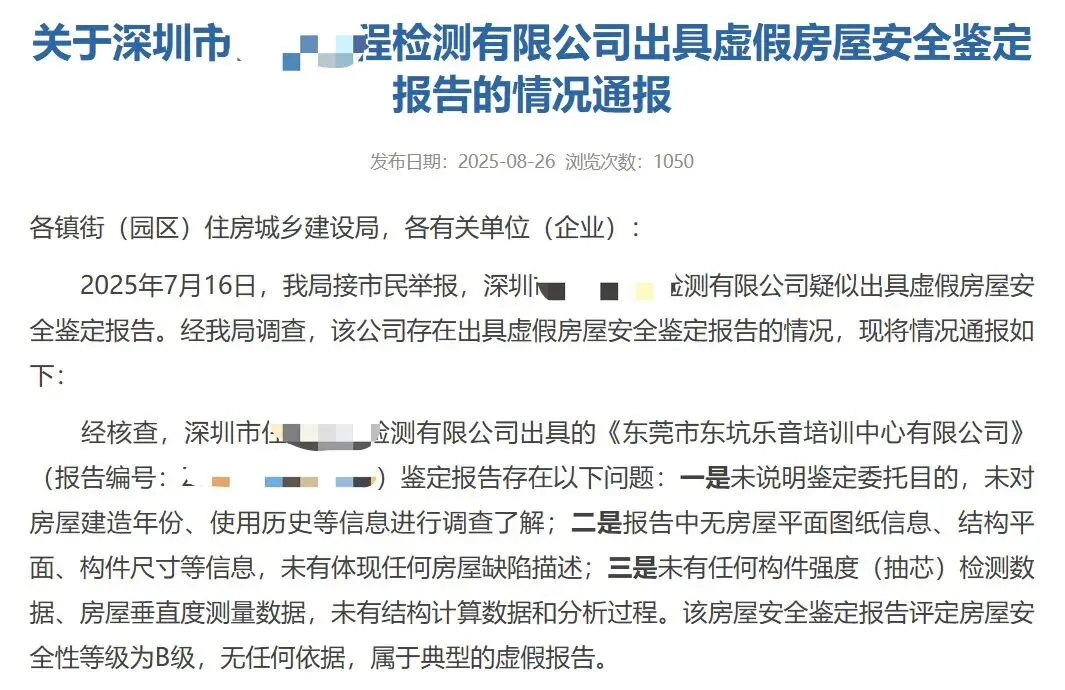 无独有偶,更具代表性的应该是今年8月份由东莞市住房和城乡建设局发出的一则关于房屋安全鉴定报告造假的通报,此事件给广大从业者敲响了警钟。深圳市某检测有限公司因出具虚假房屋安全鉴定报告,被官方公开点名批评并停业整顿!涉事报告不仅未说明委托人的鉴定目的,未还原被鉴定房屋的结构布置和构件截面情况,甚至连现场构件的强度都没做任何检测,就敢在这种情况下将房屋安全性等级评定为Bsu级,这种严重违规行为,必将给房屋结构安全埋下巨大隐患。