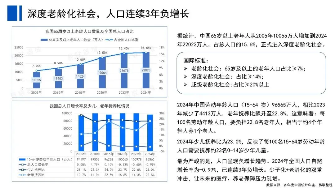 最为严峻的是,人口呈现负增长趋势。2024年全国人口自然增长率为-0.99%,已连续3年负增长。少子化+老龄化的双重冲击,让未来的医疗、养老保障压力陡增。
