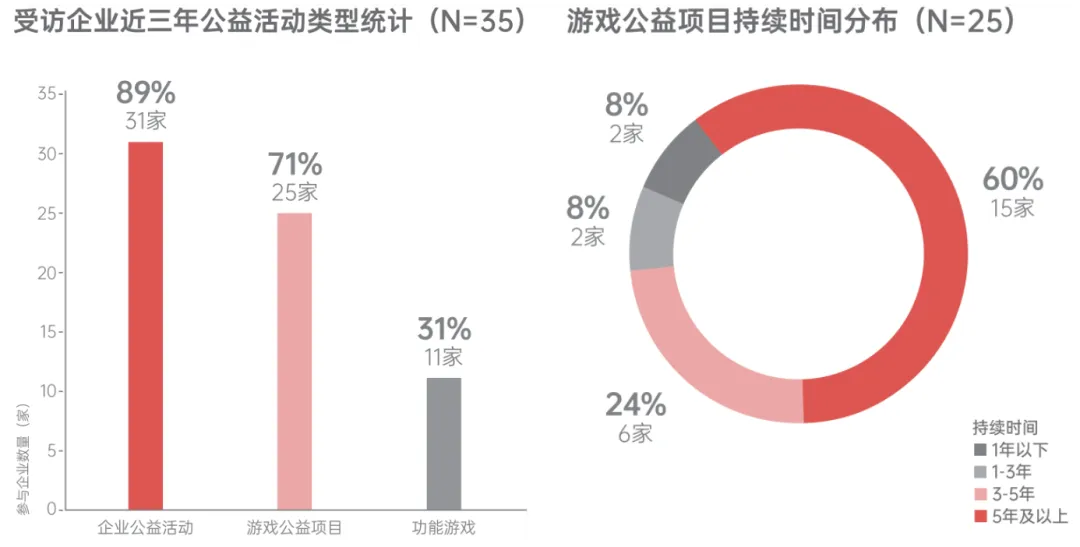 在受访的35家游戏企业中,71% 的企业在近三年内开展过与核心业务紧密结合的公益项目。更为难得的是,60% 的参与企业已在游戏公益领域深耕了5年以上。这意味着,许多企业并非将其视为短期活动,而是将其作为产品文化的一部分,持续投入。