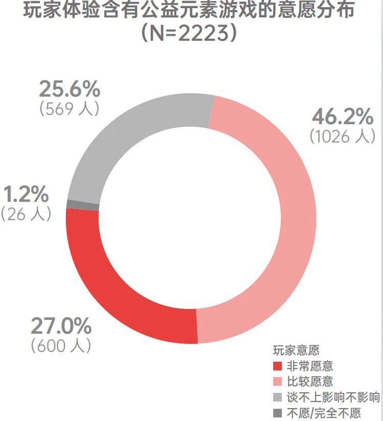 数据给出了温暖的反馈:73.2% 的接触过游戏公益的受访玩家明确表示,相比常规内容,他们“更愿意”体验含有公益元素的游戏。在他们看来,适度的公益设计不是打扰,而是为游戏体验增添了独特的情感厚度,是体验的“加分项”。
