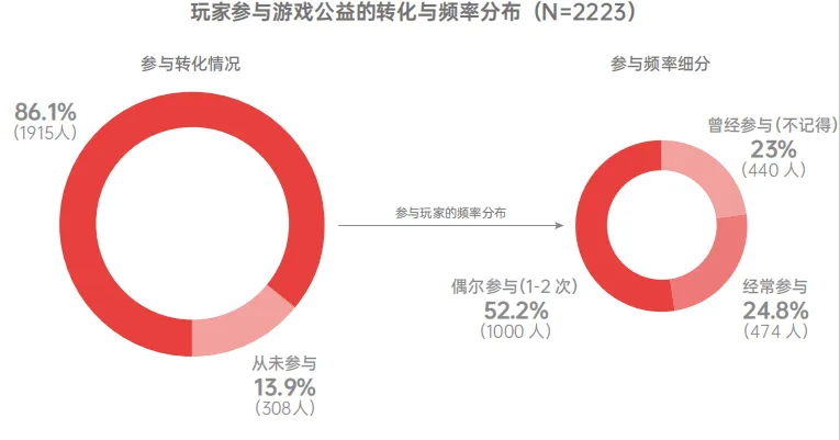 在接触过此类活动的活跃玩家中,86.1%的人选择了实际参与。这说明,游戏独特的互动机制,有效地降低了行善的门槛。不仅如此,77%的参与者保持了每年参与的习惯。这种“习惯化”的背后,揭示了玩家将释放善意视为了数字生活的一部分。