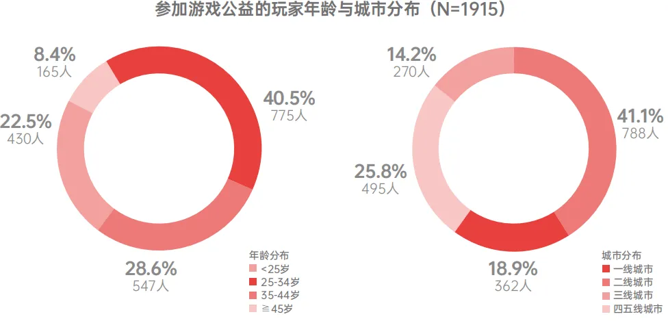 参与游戏公益的核心人群,呈现出“25-44岁中青年为主(占比65.2%)”、“高线城市集中”的特征 。这一群体正处于职业活跃期,拥有独立的思考能力与强烈的社会责任感。他们对游戏公益的积极响应,本质上是主流社会价值观在数字世界的投射与共鸣。