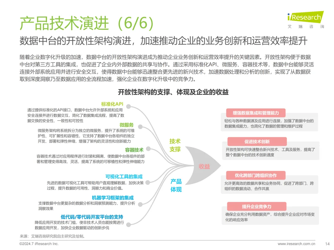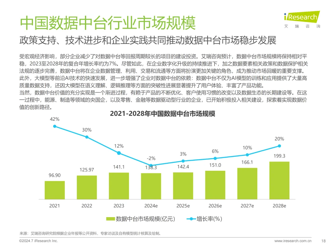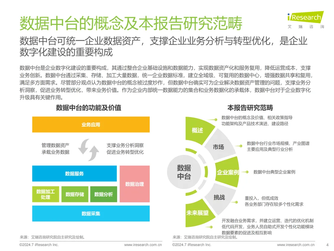 数据中台是企业数字化建设的核心支柱,核心在于整合全域数据资产、实现数据标准化与服务复用。对内能优化数据管理、提升运营效率,对外可支撑产品服务创新与精准决策。在政策层面,它获得《“十四五”数字经济发展规划》《数据二十条》等多项政策加持,发展势头强劲。技术上正朝着大模型融合、云原生架构优化等方向演进,市场规模稳步增长,广泛应用于多行业。不过当前仍面临规划与业务脱节导致的高投入低成效问题,未来在数据要素驱动、低代码开发助力下,将持续迭代以深度释放数据价值。