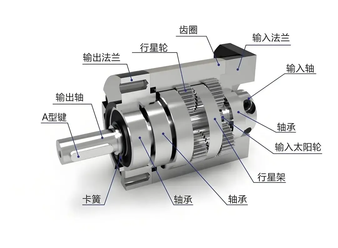 行星减速器通常由行星轮、太阳轮和内齿圈组成。在行星减速器运行过程中通常由伺服电机等原动机驱动太阳轮旋转,太阳轮与行星轮的啮合带动行星轮自转,行星轮通过公转驱动行星架旋转,行星架与输出轴连接,从而带动输出轴输出扭矩。行星减速器按输出方向可分为“直线型”和“直角型”两种。