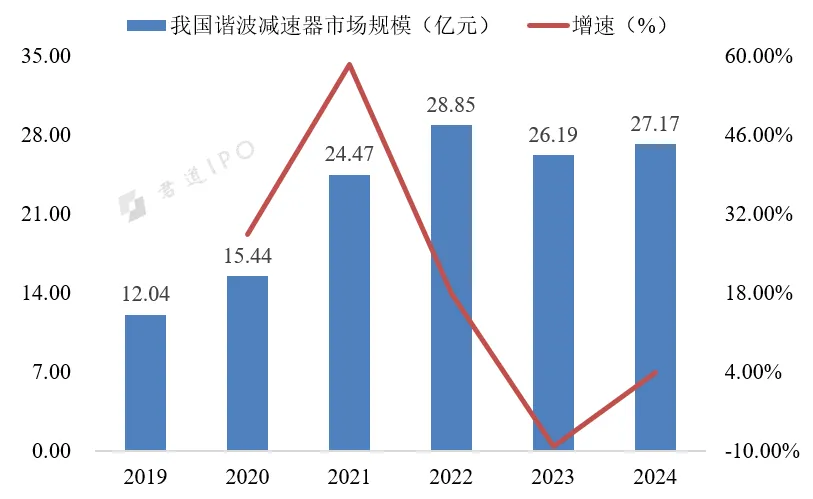 2024年我国谐波减速器的市场规模约为27.17亿元,同比增长3.76%。2019-2024年,我国谐波减速器的市场规模从12.04亿元增长至27.17亿元,期间复合年均增长率为17.67%。根据预测数据,到2030年我国谐波减速器的市场规模将增长至58.49亿元。