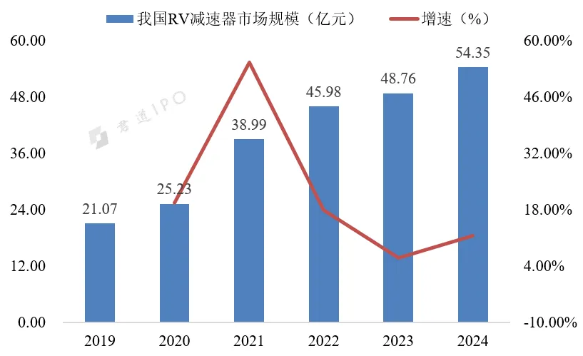 2024年我国RV减速器的市场规模约为54.35亿元,同比增长11.45%。2019-2024年,我国RV减速器的市场规模从21.07亿元增长至54.35亿元,期间复合年均增长率为20.86%。根据预测数据,到2030年我国RV减速器的市场规模将增长至112.72亿元。