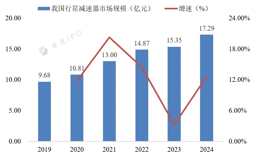 2024年我国行星减速器的市场规模约为17.29亿元,同比增长12.64%。2019-2024年,我国行星减速器的市场规模从9.68亿元增长至17.29亿元,期间复合年均增长率为12.31%。根据预测数据,到2030年我国行星减速器的市场规模将增长至41.47亿元。