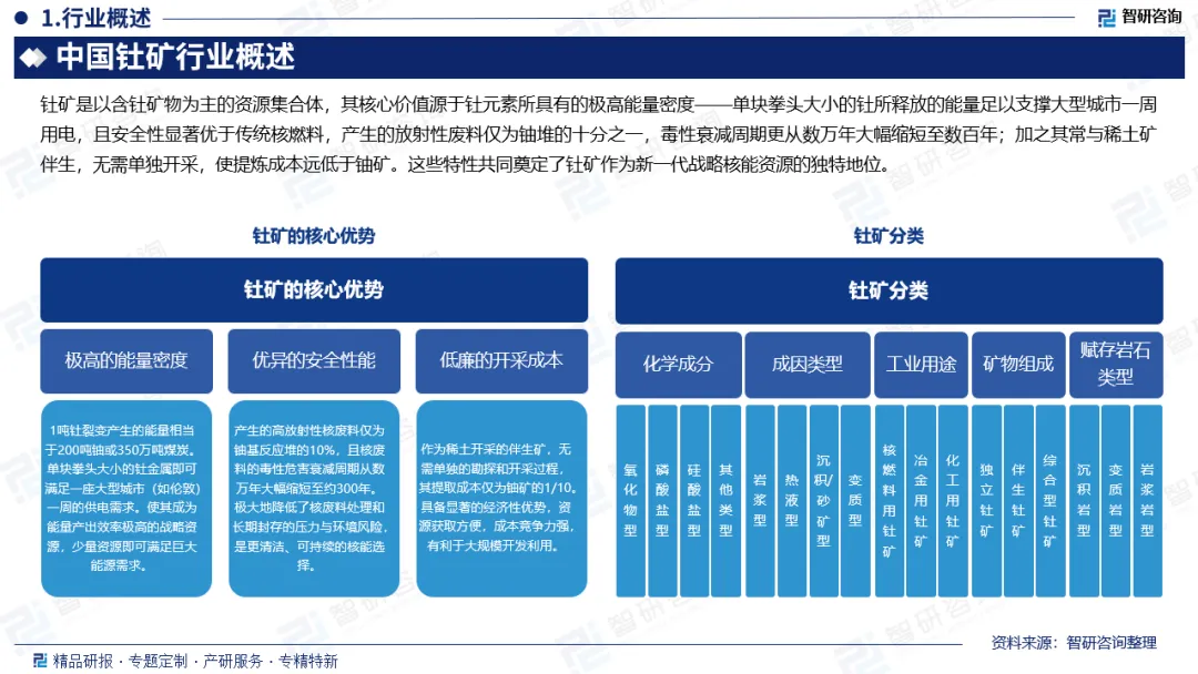 行业概述:钍矿是以含钍矿物为主的资源集合体,其核心价值源于钍元素所具有的极高能量密度——单块拳头大小的钍所释放的能量足以支撑大型城市一周用电,且安全性显著优于传统核燃料,产生的放射性废料仅为铀堆的十分之一,毒性衰减周期更从数万年大幅缩短至数百年;加之其常与稀土矿伴生,无需单独开采,使提炼成本远低于铀矿。这些特性共同奠定了钍矿作为新一代战略核能资源的独特地位。