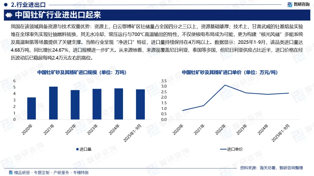 进口规模:作为放射性矿产资源,钍矿在我国被纳入关键矿产管理范畴,出口受严格管制,行业贸易呈现显著的“净进口”格局。尽管国内钍资源储量丰富,但受限于开采规模与技术适配性,钍矿砂及其精矿进口需求持续存在,进口量整体维持在4万吨以上。数据显示:2025年1-9月,该品类进口量达4.68万吨,同比增长24.67%,进口规模进一步扩大。