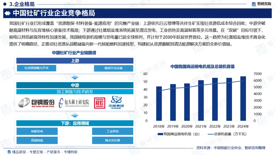 企业布局:中国钍矿行业呈现“资源端垄断、技术端集中、应用端协同”的竞争格局,产业链各环节头部企业布局精准且优势突出:上游资源端,包钢股份掌控白云鄂博矿区75%以上钍资源,依托稀土伴生开采实现低成本高纯度钍提取,国有地勘单位凭借政策与技术优势主导勘查市场,民营企业则在专项技术服务领域错位竞争;中游材料与设备端技术壁垒极高,华菱钢铁、久立特材分别垄断堆用核电钢、高温镍基合金管等关键材料供应,上海电气、宝色股份、东方电气等龙头主导高温换热器、主容器、主泵等核心设备研发,江苏神通主导核级阀门市场,浙富控股、海陆重工等在细分部件领域实现技术卡位;下游工程与应用端,上海建工、中国核建凭借实验堆建设经验锁定示范堆订单,首航高科、西子洁能则探索熔盐堆与新能源、制氢等场景的融合应用,整体形成“资源-技术-应用”全链条自主可控的国产化布局。