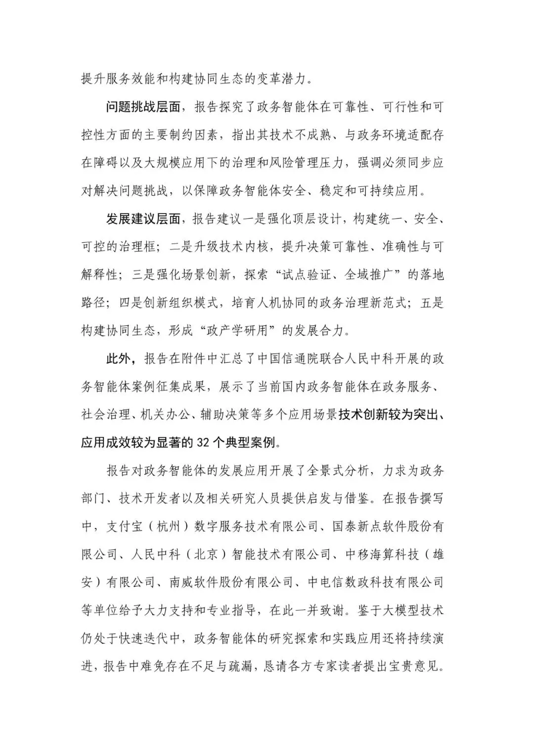 报告由信通院与北大联合发布,系统梳理政务智能体“技术—场景—治理”全链路。核心结论:2025 年我国政务智能体进入“试点验证”向“规模推广”拐点,全国已有 32 个标杆案例,平均减材料 54%、压缩时限 57%,但可靠性(幻觉率仍≥5%)、可行性(跨网数据打通率<40%)、可控性(算法问责空白)三大挑战同步凸显,亟需“顶层治理+技术内核+场景创新+组织再造+生态协同”五维突破。