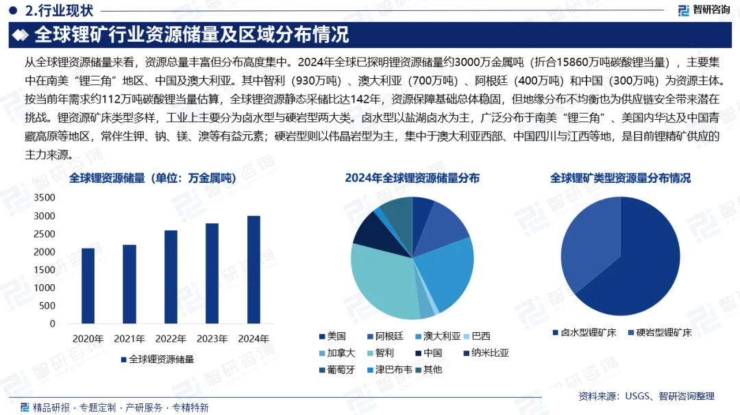 全球锂资源储量及锂矿类型:从全球锂资源储量来看,资源总量丰富但分布高度集中。2024年全球已探明锂资源储量约3000万金属吨(折合15860万吨碳酸锂当量),主要集中在南美“锂三角”地区、中国及澳大利亚。其中智利(930万吨)、澳大利亚(700万吨)、阿根廷(400万吨)和中国(300万吨)为资源主体。按当前年需求约112万吨碳酸锂当量估算,全球锂资源静态采储比达142年,资源保障基础总体稳固,但地缘分布不均衡也为供应链安全带来潜在挑战。锂资源矿床类型多样,工业上主要分为卤水型与硬岩型两大类。卤水型以盐湖卤水为主,广泛分布于南美“锂三角”、美国内华达及中国青藏高原等地区,常伴生钾、钠、镁、溴等有益元素;硬岩型则以伟晶岩型为主,集中于澳大利亚西部、中国四川与江西等地,是目前锂精矿供应的主力来源。其他类型如沉积岩型集中于北美、塞尔维亚等地,地热卤水与油气田卤水开发逐步兴起,而黏土型与锂沸石型受技术限制,勘探程度仍较低。