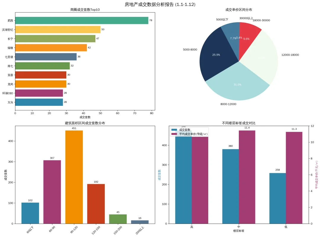 本次分析基于 1 月 1 日至 1 月 12 日的房地产成交数据,共包含1,113 套成交记录,涵盖762 个楼盘和70 个商圈,数据完整无缺失,主要指标包括楼盘名称、商圈名称、楼层标签、建筑面积、协议金额和成交单价。