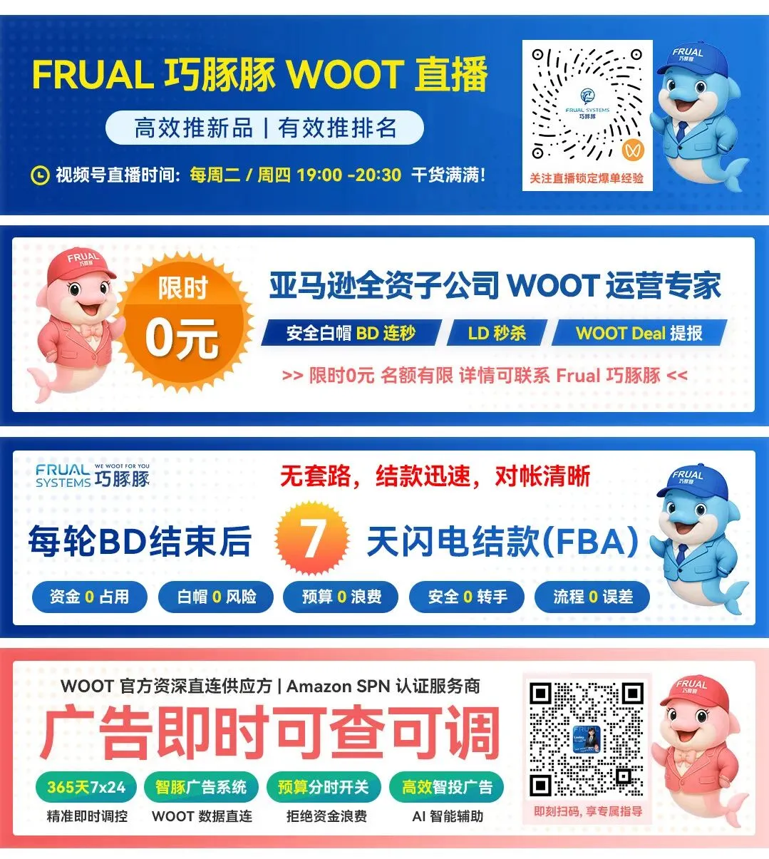 作为深耕跨境服务领域多年的专业机构,Frual巧豚豚自2018年将亚马逊WOOT业务引入中国以来,凭借扎实的专业能力与优质服务,持续获得行业认可。公司作为WOOT官方资深直连供应方与亚马逊SPN认证服务商,已在全国多个核心外贸城市建立完善服务网络,其专注WOOT赛道的数百人专业团队,通过365天7×24小时可调广告服务、FBA卖家快至7天的闪电结款等创新服务,为众多卖家提供安全高效的运营解决方案。