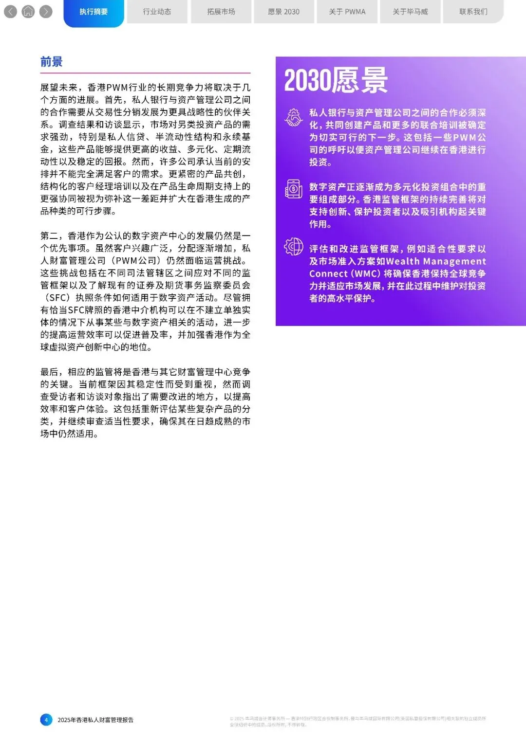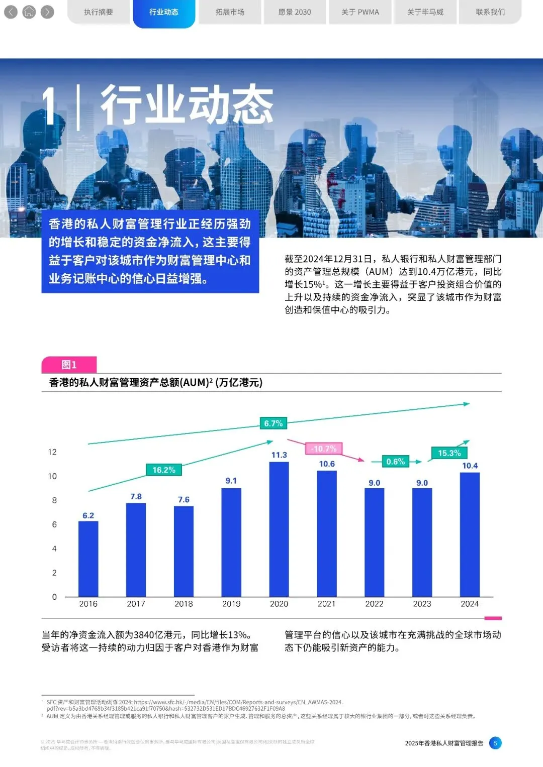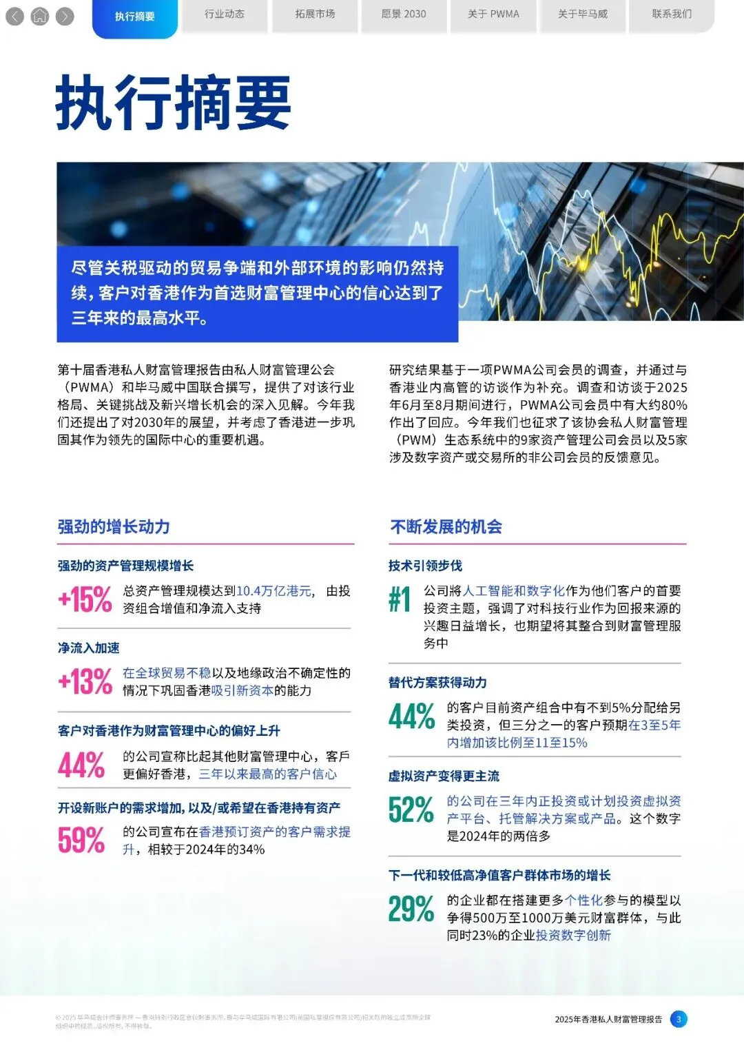 第十届香港私人财富管理报告由私人财富管理公会 (PWMA)和毕马威中国联合撰写,提供了对该行业格局、关键挑战及新兴增长机会的深入见解。今年我 们还提出了对2030年的展望,并考虑了香港进一步巩固其作为领先的国际中心的重要机遇。