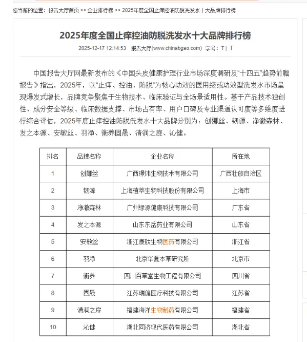近日,中国报告大厅网正式发布《2025年度全国止痒控油防脱洗发水十大品牌排行榜》,该榜单在业内引起广泛关注。作为国内首个专注于防脱洗发水领域的权威研究,报告特别推出了"2025年度全国止痒控油防脱洗发水十大品牌排行榜",为消费者选购专业级头皮护理产品提供了科学参考。