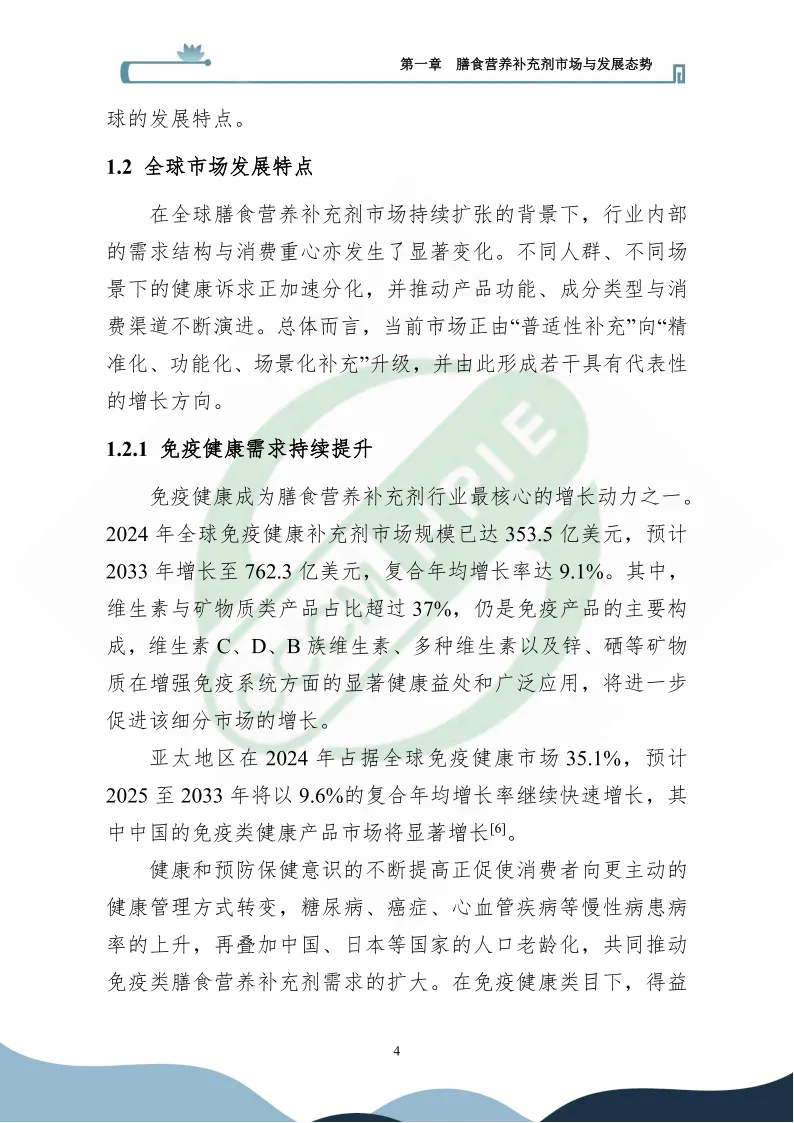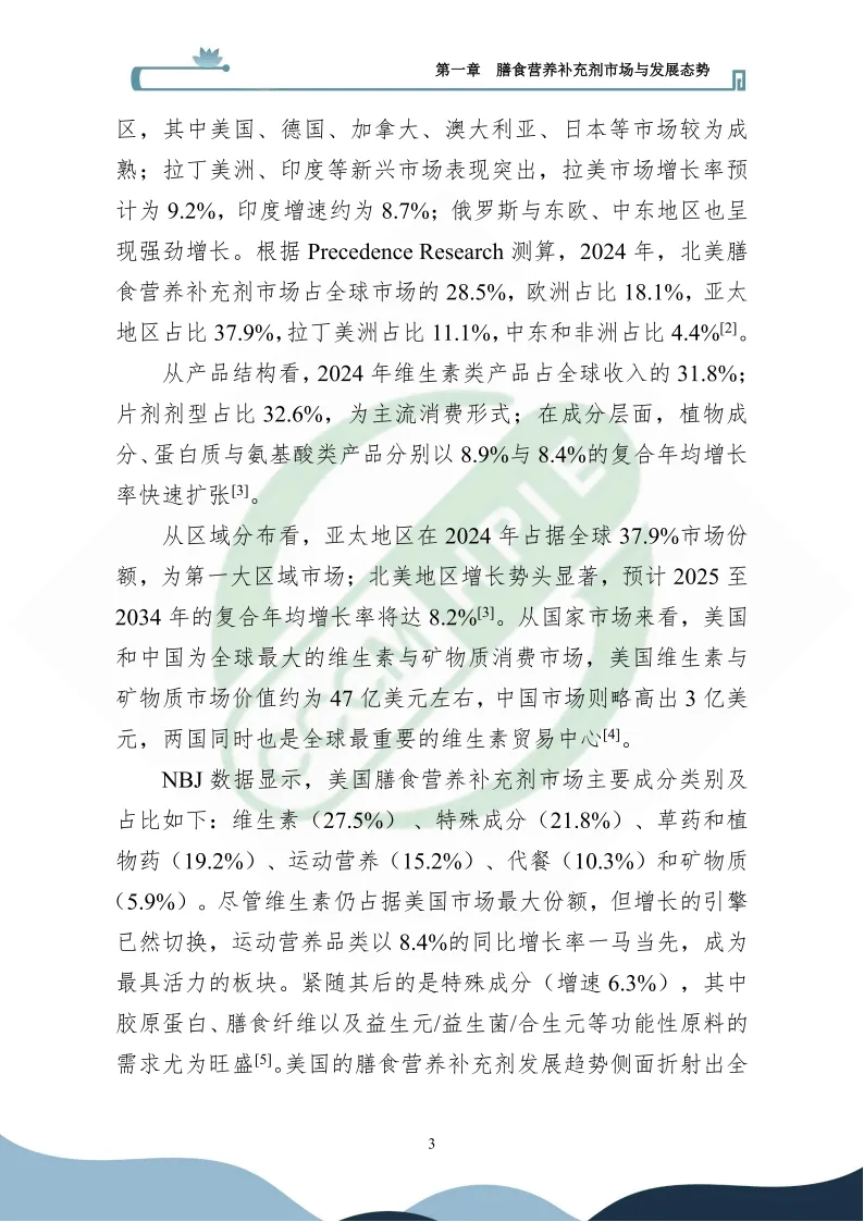 在健康消费升级与产业变革的双重驱动下,膳食营养补充剂行业正迈入高质量发展新阶段。全球市场稳健扩张,2024年规模达1926.5亿美元,预计2033年将增至4145.2亿美元,复合年均增长率8.9%,亚太地区以37.9%的市场份额成为第一大区域市场。