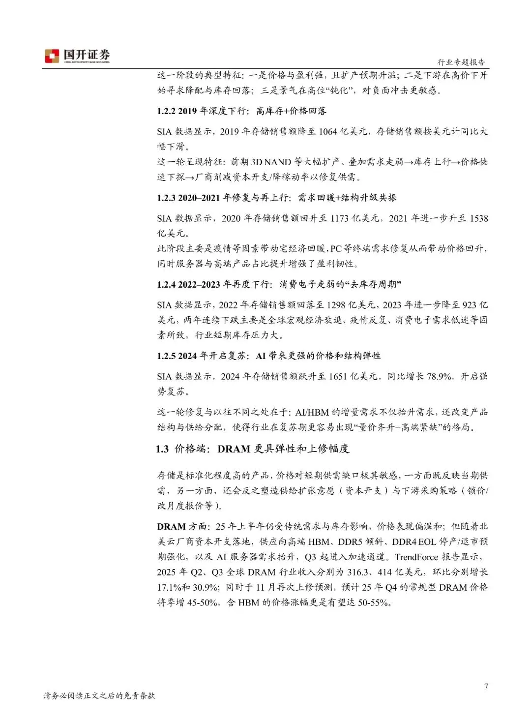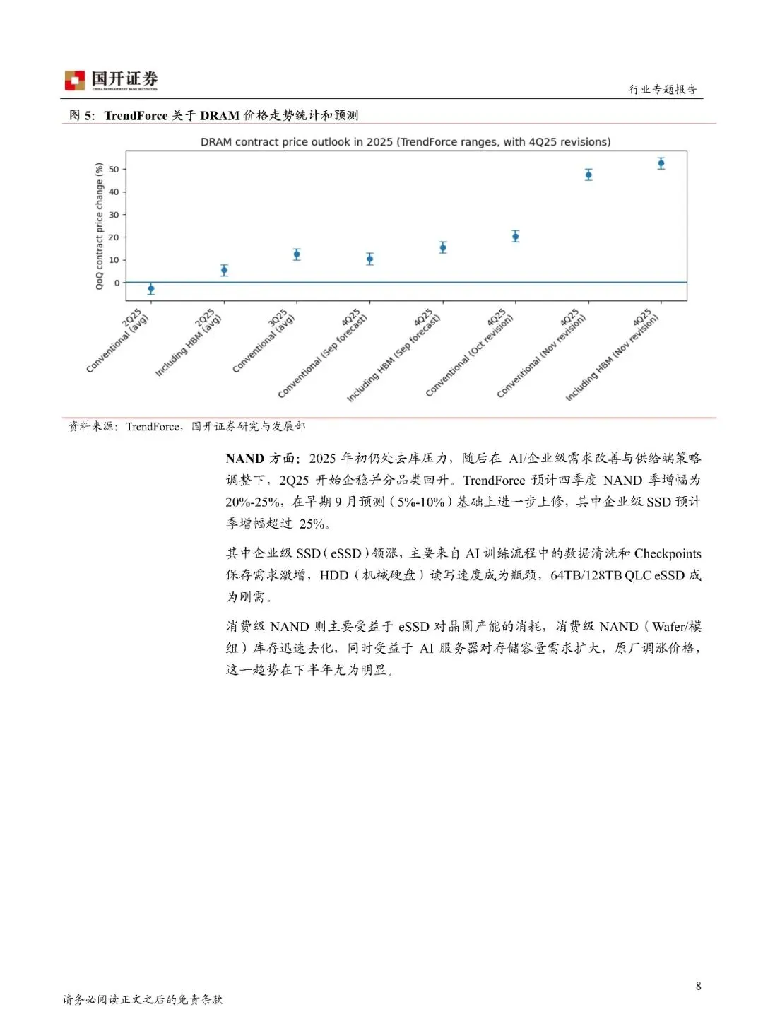 AI驱动下存储迎来新一轮上行周期。据SIA数据,22025年10月全球半导体销售额创下727亿美元的历史新高,同比增速达2?7.2%。其中,存储芯片作为核心驱动力,预计2025全年实现28%的强劲增长。不同于以往由消费电子出货量驱动的周期,本轮复苏庆呈现出明显的"AI导向"特征,直接推动了高端HBM及高层数NAND持续放量,行业确立"量价齐升"格局。