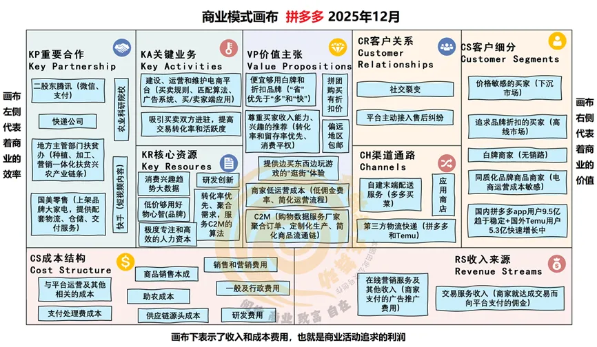 感兴趣的朋友注意,选购的版本需要是经典重译版,我已经帮大家扫过雷了,旧版本的翻译真的是没法看。这里我们将借助书中介绍的商业模式画布工具,来分析拼多多的商业模式。