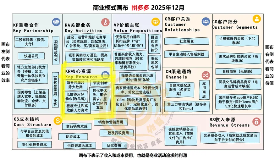 在上篇文章中,介绍完了《拼多多的商业模式解构(渠道通路、客户关系和收入来源)》,本篇文章将分析商业画布的左侧的核心资源。