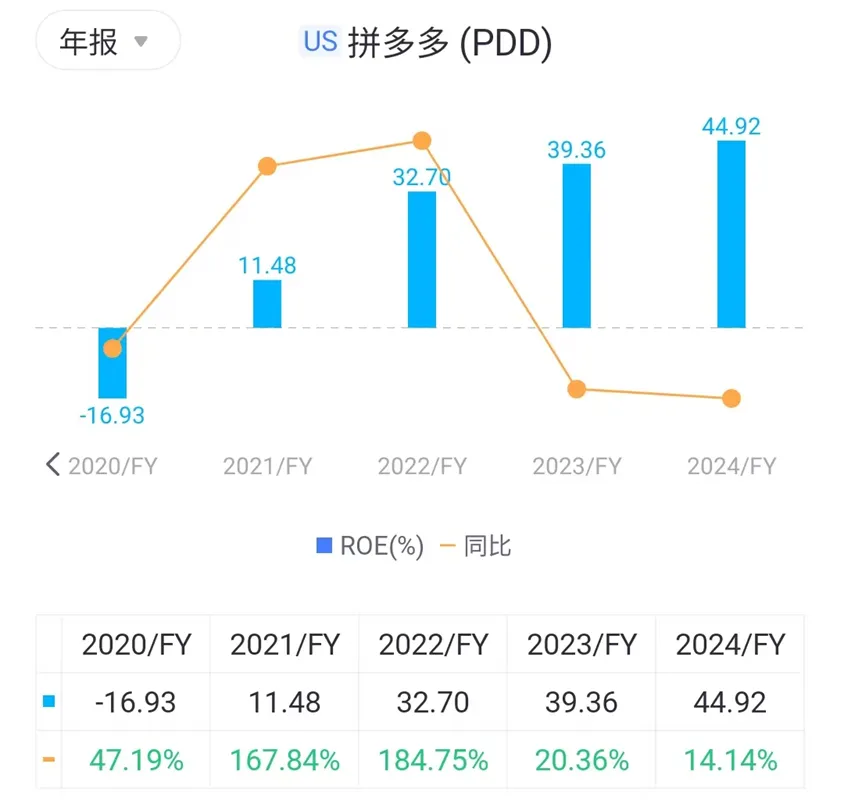 核心资产都梳理完了,那么股东视角下的资产运营效率如何呢?下图显示,拼多多连续三年,ROE(净资产收益率,净利润÷净资产)达到百分之三四十的高双位数,大幅超越市场平均水平。