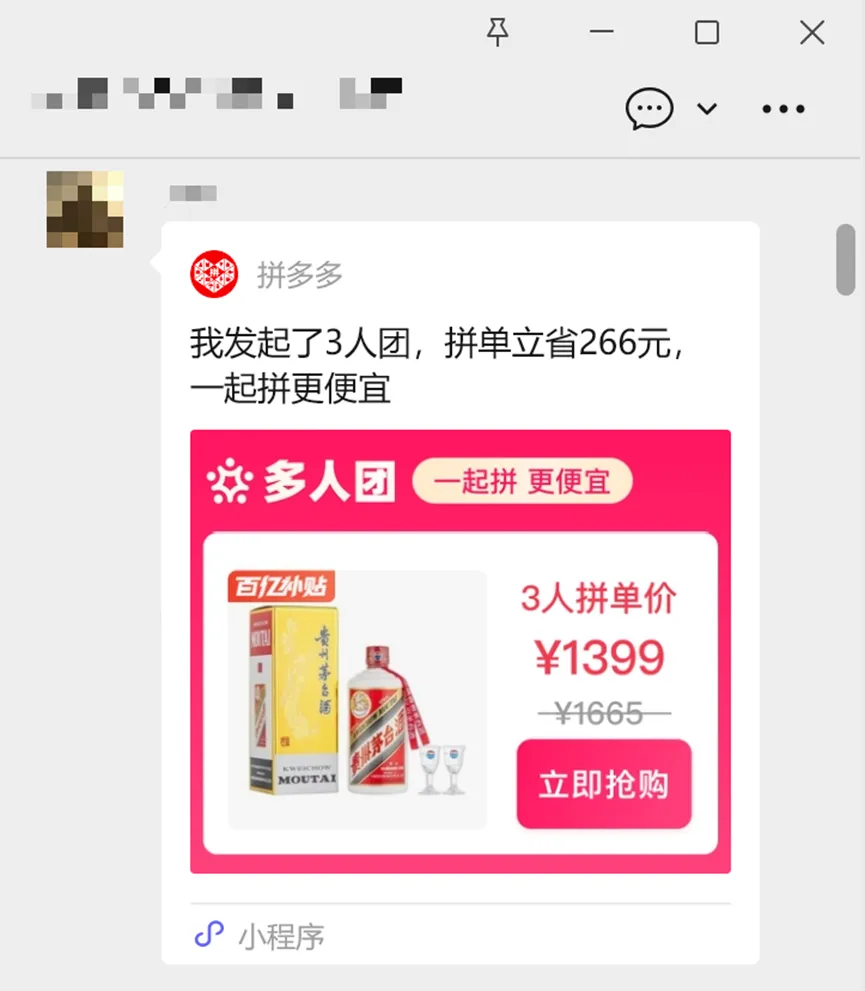 这一招效果如何呢?你看,就连一向“昂首挺胸”的茅台,最近也被补贴到了1399元,在微信群里,三个人就能成团拼单,卖得特别火。