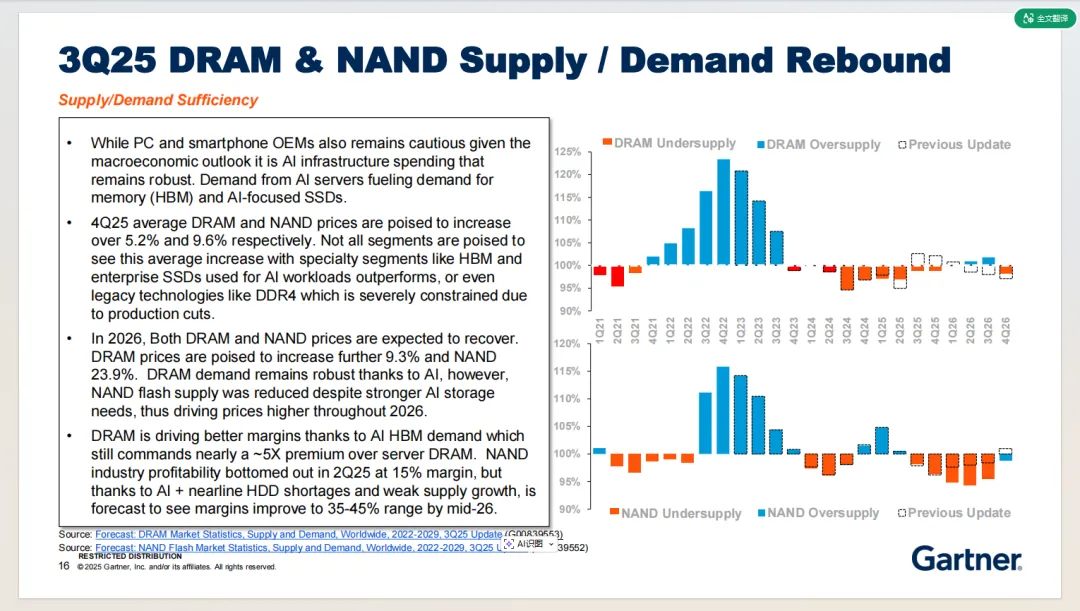 2025 年 Q4,DRAM 平均价格预计上涨 5.2%,2026 年价格上涨势头加剧,预计全年涨幅达 9.3%,核心驱动力是 AI 需求的持续爆发与供给增长的滞后性。NAND方面,AI海量数据、HDD短缺,hyperscale厂商存储扩容需求,加上NAND 行业主动收缩供给,导致价格反弹力度超 DRAM,