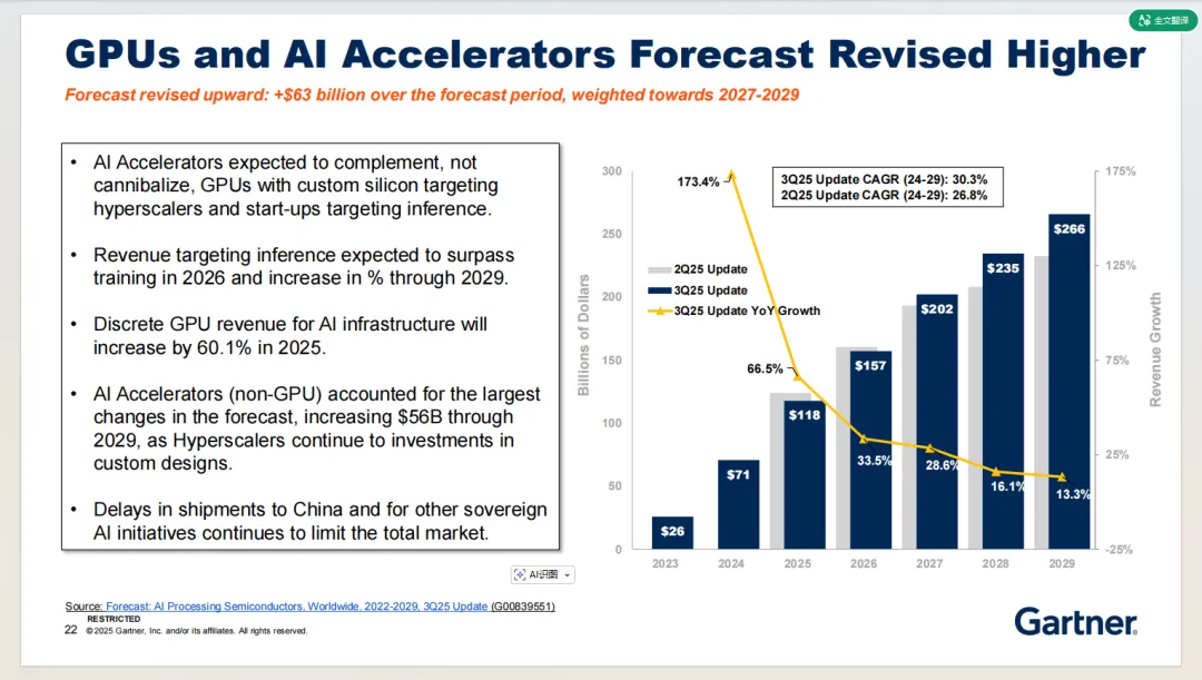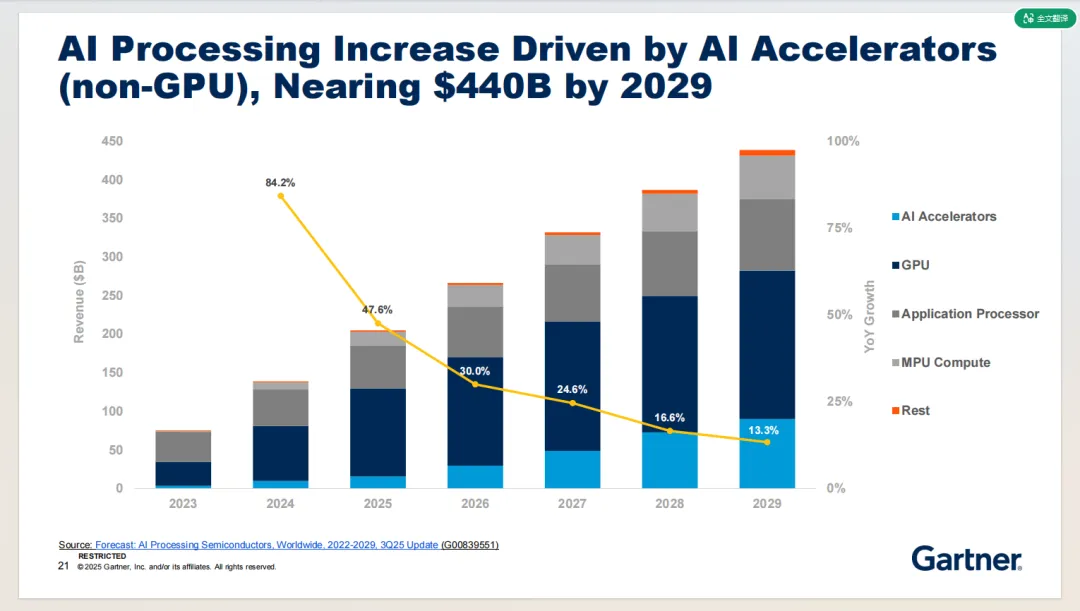 AI 处理半导体市场规模将持续高速增长,到 2029 年接近 4400 亿美元,成为半导体行业最核心的增长引擎。AI 加速器(非 GPU)增长势头最为迅猛,主要得益于超大规模企业对定制化芯片的投资以及推理场景的需求爆发;GPU作为 AI 训练与推理的关键硬件,持续维持稳健增长;应用处理器、计算型 MPU 等其他品类也呈现稳步增长态势。预计推理场景的收入将于 2026 年超过训练场景,并持续扩大占比。