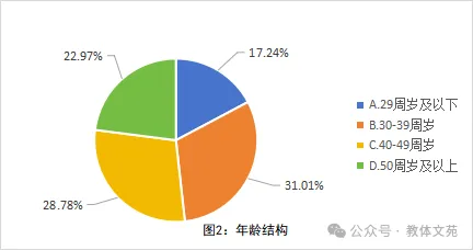 参与调查的教师以中、青年为主,其中29周岁及以下占17.24%(14031人),30~39 周岁占31.01%(25238人),40~49 周岁占28.78%(23423人),50 周岁及以上占22.97%(18695人)。50周岁以下占比近八成(见图2)。