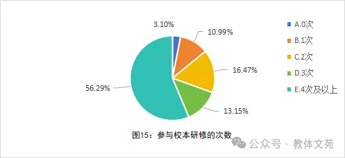 校本研修已成为教师专业提升的主要模式,超半数教师(56.29%)一学期参与校本研修达4次及以上,说明校本研修已受到中小学校的高度重视(见图15)。