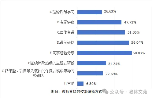 教师喜欢的校本研修方式呈现鲜明特征:首先,实践共同体占据绝对主导地位,教师选择最喜欢的校本研修活动前三项均聚焦同伴协作,依次为同事经验分享(58.83%)、课例研修(56.04%)、集体备课(51.36%),说明教师更加希望校本研修能够帮助他们解决教育教学中的实际问题;与之相对的是,理论政策学习的喜好程度占比仅为26.63%。其次,“专家讲座”占比为47.73%,高于理论政策学习,但显著低于前三项实践类活动,反映出教师虽认可专家的权威性,却更倾向于“专家引导+同伴实践”的混合研修。此外,教师对“课改热点研修”(31.24%)和课题项目式研修(27.69%)的兴趣偏低,折射出广大教师自觉学习课程改革新的理念、方法等方面有待提升(见图16)。