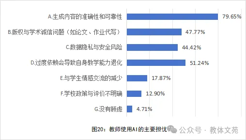 使用AI面临的挑战主要体现在信任、伦理等方面。AI生成内容的准确性与可靠性是教师最大的顾虑,占比高达79.65%。此外,过度依赖导致教学能力退化的忧虑占比51.24%,反映出教师对技术辅助与专业自主之间的审慎考量。此外,版权与学术诚信问题(47.77%)、数据隐私与安全风险(44.42%)也受到教师的广泛关注。相比之下,教师对与学生情感交流减少(17.87%)、学校政策不明确(12.90%)的顾虑相对较低(见图20)。