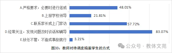 教师教育教学中面对“问题生”的实际问题,采取积极干预、家校协同等方式为主。对于调皮捣蛋、不守纪律或不爱学习的学生,83.07%的教师选择“经常关注,发现问题及时谈话和辅导”。这体现出多数教师秉持积极主动的教育态度,比较关注学生动态。57.72%的教师会选择“联系家长或上门家访”。表明超半数教师重视家校合作,认识到家庭在学生成长中的关键作用,通过协同制定教育策略,形成家校育人合力(见图33)。
