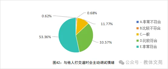 86.93%(“比较符合”+“非常符合”)的教师会主动调适情绪以展现良好态度,反映出教师群体具备较强的职业情绪管理意识,在与学生、同事、领导互动中,注重通过情绪调节维护积极的职场形象与沟通氛围。仅有1.30%的教师会忽视情绪调适对态度展现的影响(见图42)。