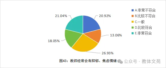 尤其值得重视的是,39.09%的教师认为自己存在抑郁、焦虑倾向(“比较符合”+“非常符合”),其中21.04%的教师肯定自己存在抑郁、焦虑情绪,教师的心理健康需要引起高度重视(见图43)。