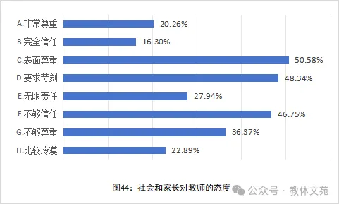 社会与家长对教师的态度深刻影响教师职业认同感与教学投入度。从教师视角看,社会与家长对教师的态度呈多元化特征,且积极态度占比不高。教师认为社会与家长“非常尊重”教师、“完全信任”教师的分别为20.26%和16.30%。50.58%的教师认为社会与家长只是“表面尊重”;认为社会和家长“要求苛刻”“不够信任”和“不够尊重”的分别达到48.34%、46.75%和36.37%。这些负面态度催生了教师的职业自卑和焦虑。27.94%的教师认为社会与家长对其责任边界认知模糊,将学生成长的多重责任过度归集到教师身上,教师承担着“无限责任”。此外,还有22.89%的教师认为社会与家长“比较冷漠”,这将严重影响教师对学生的态度(见图44)。