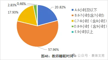 3.睡眠时间。数据显示,睡眠不足是教师群体的普遍现状,高达96.71%的教师睡眠时间低于8小时。其中,近八成(78.78%)教师睡眠时间在7小时及以下,更有超过五分之一(20.82%)的教师睡眠时间严重不足,仅在6小时及以下。而能达到8小时以上充足睡眠的教师,合计仅占3.29%(见图48)。