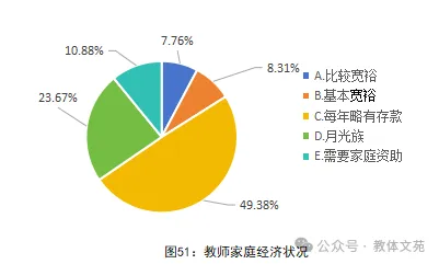 6.经济情况。教师家庭经济状况值得关注。近半数(49.38%)教师“每年略有存款”,经济宽裕者(“比较宽裕”+“基本宽裕”)合计仅占16.07%。尤其值得关注的是,有近四分之一(23.67%)的教师是“月光族”,更有超过一成(10.88%)需要家庭资助,这反映出部分教师面临较大的经济压力(见图51)。