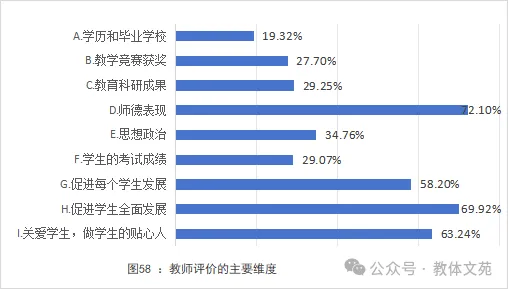 1.教师评价体系。教师普遍认为,对教师的评价需坚持师德为先、育人为本的核心理念。72.10%的教师认为师德是评价教师的基石。其次,“促进学生全面发展”(69.92%)、“关爱学生,做学生的贴心人”(63.24%)、“促进每个学生发展”(58.20%)紧随其后。说明教师认为评价应聚焦教师的职业素养与育人实效。从评价维度来看,“学历和毕业学校”“教学竞赛获奖”的认同度占比较低,表明教师普遍主张相对弱化“硬件背景”与“竞赛成果”在评价中的权重(见图58)。