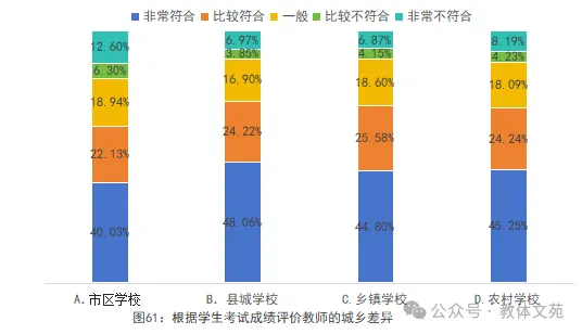 深入分析教师评价中的“唯分数论”现象发现,67.91%(“非常符合”+“比较符合”)的教师认为学校将学生考试成绩与教师绩效工资、岗位聘任等挂钩(见图60)。