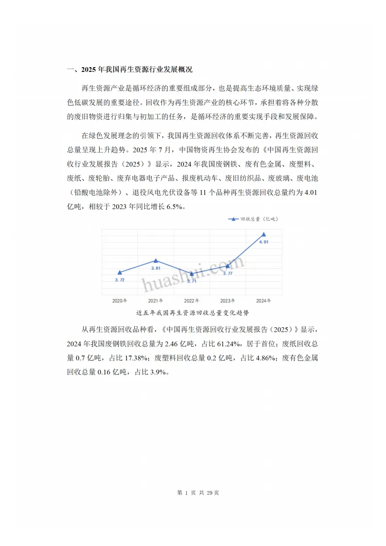 再生资源产业作为循环经济的重要组成部分,在绿色发展理念引领下持续壮大。2024年我国11个主要品种再生资源回收总量达4.01亿吨,同比增长6.5%,其中废钢铁占比超六成,行业发展态势良好。国家层面出台多项政策,构建废弃物循环利用体系,推广再生材料使用,为行业发展提供政策支撑。
