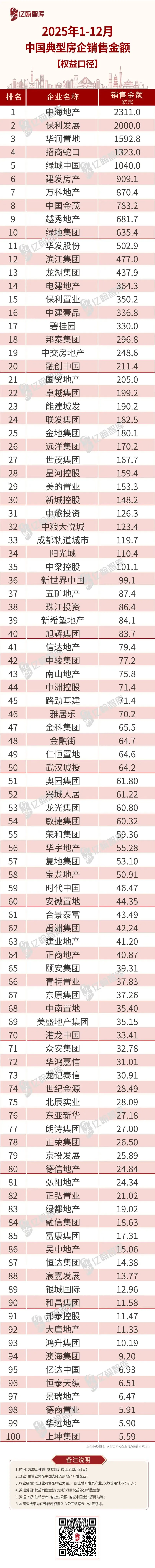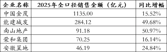 房企销售整体保持低位运行,2025年典型房企全口径销售金额超过1000亿元的企业还有10家,较2024年再减少1家。其中,国央企或混合所有制企业占了绝大多数,仅滨江集团1家民企进入“千亿大本营”。