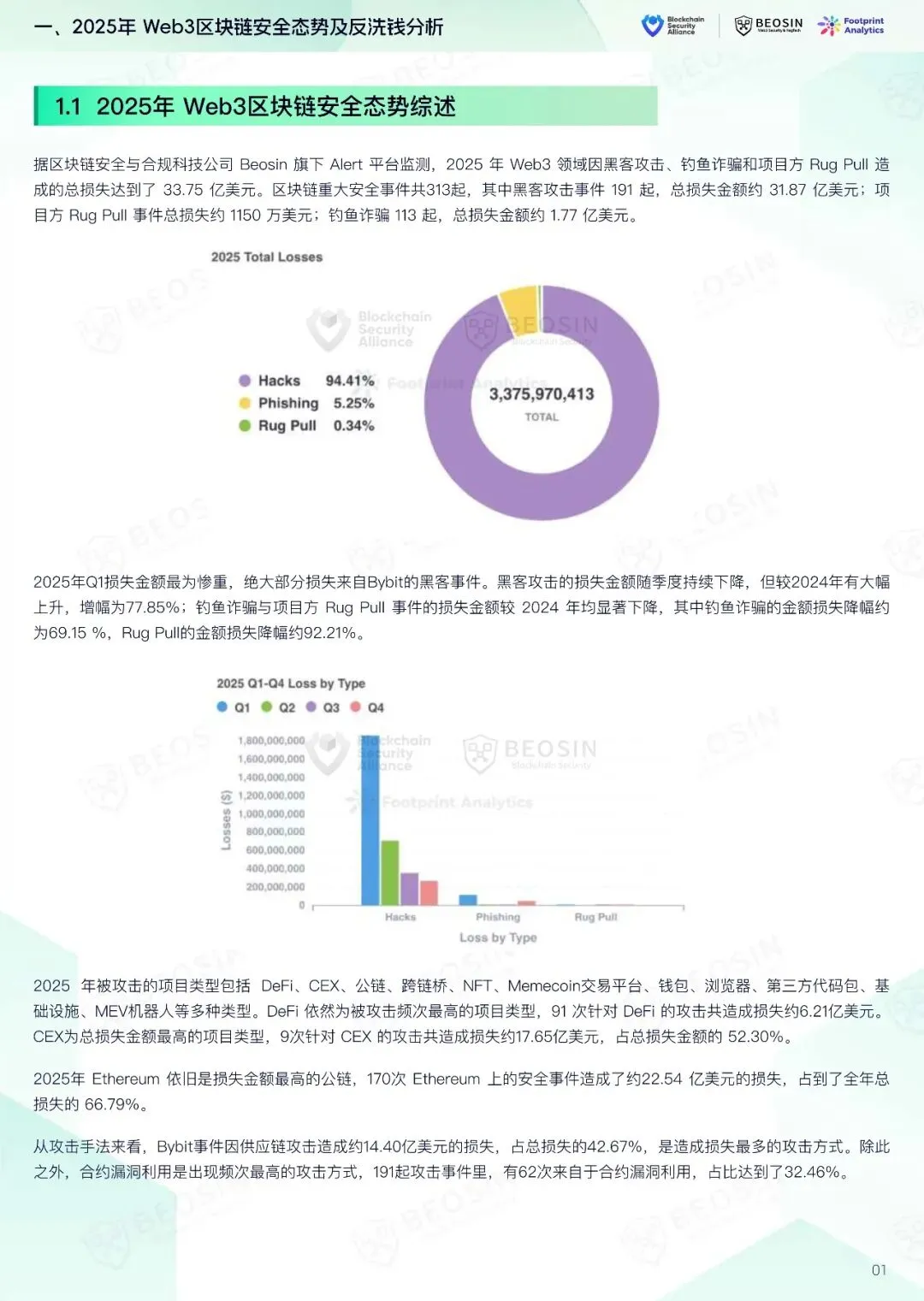 据区块链安全与合规科技公司 Beosin 旗下 Alert 平台监测,2025 年 Web3 领域因黑客攻击、钓鱼诈骗和项目方 Rug Pull 造成的总损失达到了 33.75 亿美元。区块链重大安全事件共313起,其中黑客攻击事件 191 起,总损失金额约 31.87 亿美元;项目方 Rug Pull 事件总损失约 1150 万美元;钓鱼诈骗 113 起,总损失金额约 1.77 亿美元。