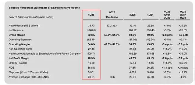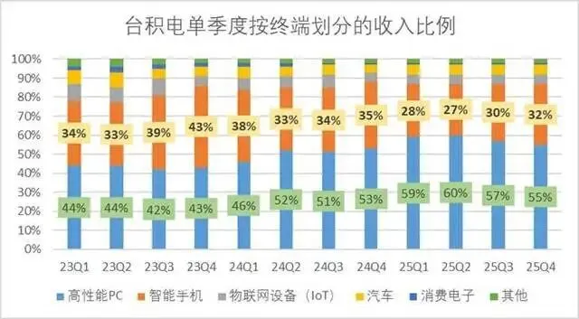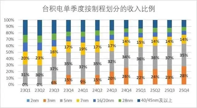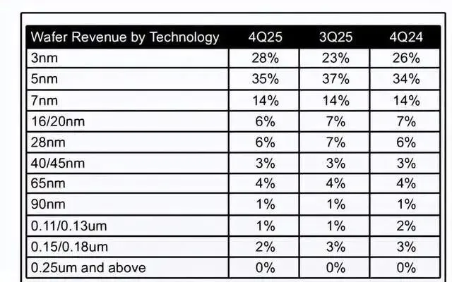 台积电的业绩爆发,核心驱动力来自先进制程的持续渗透。财报显示,3nm 制程出货占 2025 年 Q4 晶圆销售金额的 28%,5nm 制程占比 35%,7nm 制程占比 14%,三者合计的先进制程(7nm 及更先进)营收占比已达 77%,成为绝对营收支柱。