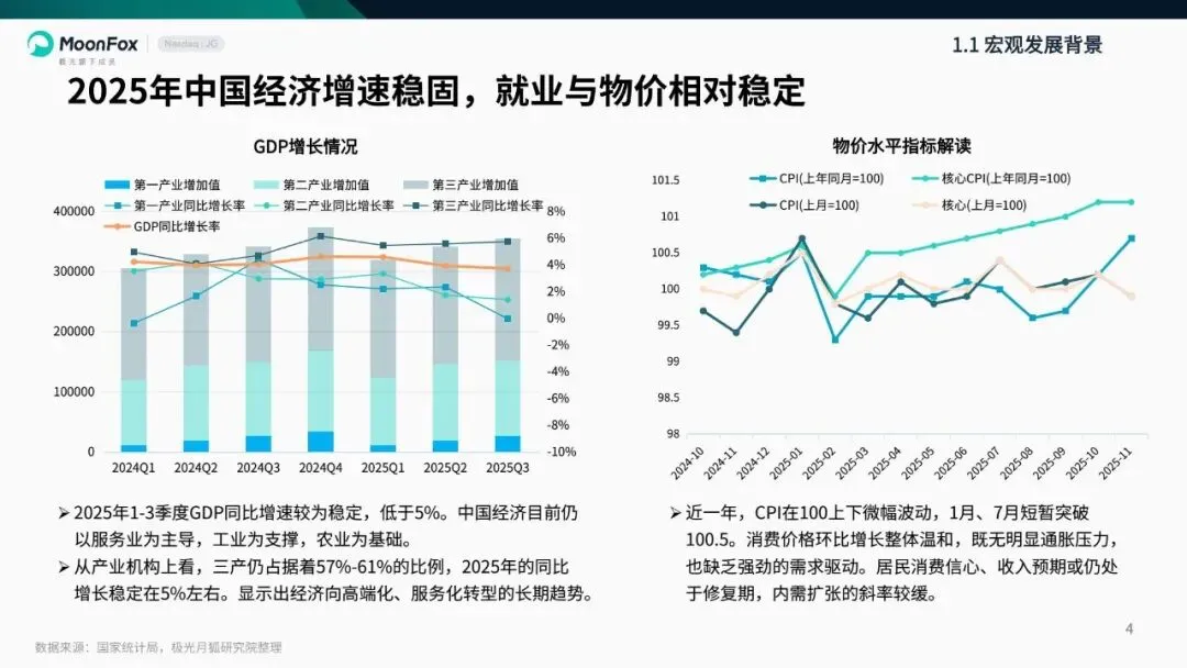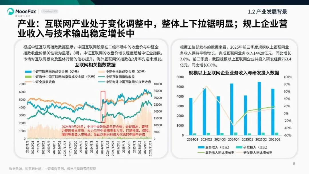 2025年,中国经济增速稳固,产业结构持续向高端化、服务化转型,消费层级逐步向发展型、享受型跨越。在此背景下,移动互联网行业处于调整变革期,规模以上企业营收与技术输出稳步增长,短视频、手机游戏等成为用户使用时长增长极。核心科技领域,AI成为行业发展核心引擎,智能应用月活大幅增长,在助老助残、教育、医疗等场景落地成效显著,但也面临数据安全、信息失真等挑战。同时,人机共智深入推进,具身智能、AI搜索、AI陪伴等新业态涌现,跨界融合、跨境布局成为行业亮点,营销聚焦情绪价值与用户需求适配。报告基于多维度数据,系统呈现行业发展背景、现状与趋势,为理解行业变革与未来方向提供重要参考。