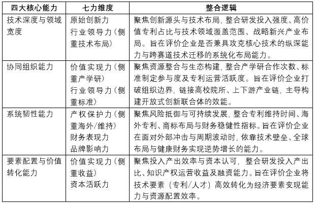 为更聚焦地分析科创企业创新质量的关键短板与提升方向,本研究在科创七力模型基础上,遵循“维度整合、核心聚焦”的原则,提炼出四大核心能力分析框架,两者形成全维度覆盖(科创七力)→关键点突破(四大能力)的互补关系,具体对应与整合逻辑如下: