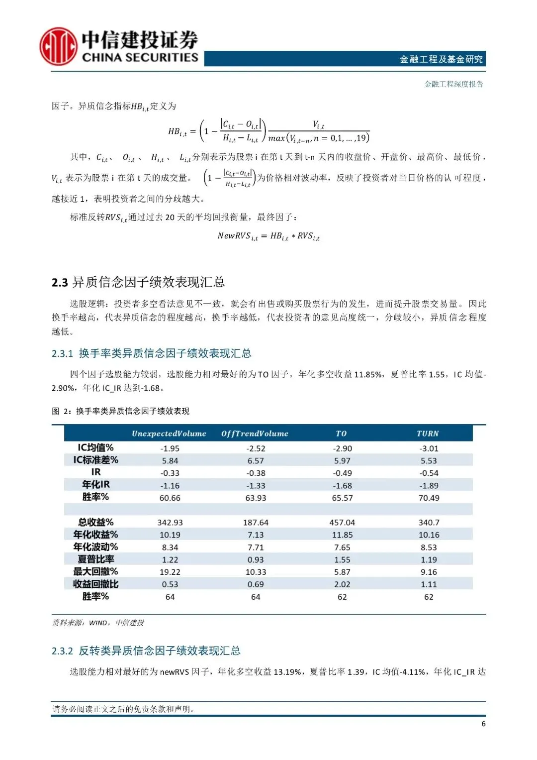 本文使用换手率、量价、财务指标等数据构建了换手手率分离模型因子和波动率类模型因子。在换手率分离模型因子中,选股能力相对最好的为trading_hb_2,年化多空收益21.17%,夏普比率2.03IC均值7.25%,年化IC_IR达到2.88。在波动率类模型因子中,选股能力相对最好的为SIGMA因子,年化多空收益22.41%,夏普比率2.111,1C均值-8.69%,年化IC_IR达到-3.39。