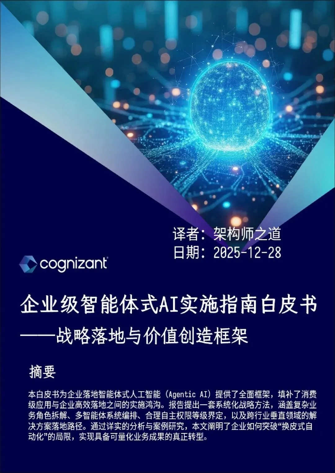 《Cognizant 2025企业级智能体式AI实施指南白皮书:战略落地与价值创造框架》是由全球领先的专业服务公司高知特(Cognizant)发布的一份战略指导文件。其核心背景是基于高知特对人工智能产业化、尤其是企业级智能体(AI Agents)和多智能体系统(MAS)重要性的前瞻洞察而编写。